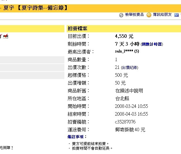 今日閒來無事,去逛逛雅虎拍賣,用「夏宇」搜尋,買到了短缺的夏宇「愈混樂隊」。再看看其它書目,居然有「備忘錄」上網拍賣,結帳日期還有七天,卻已經標到四千五百五十元。