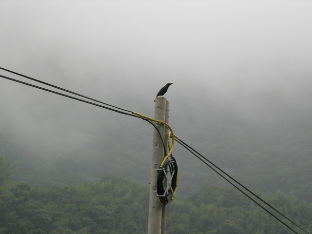 停在電線桿上的應該是烏鴉吧。