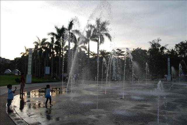 黃昏的高雄中央公園,小孩在水柱中衝來衝去,淡淡的幸福感。