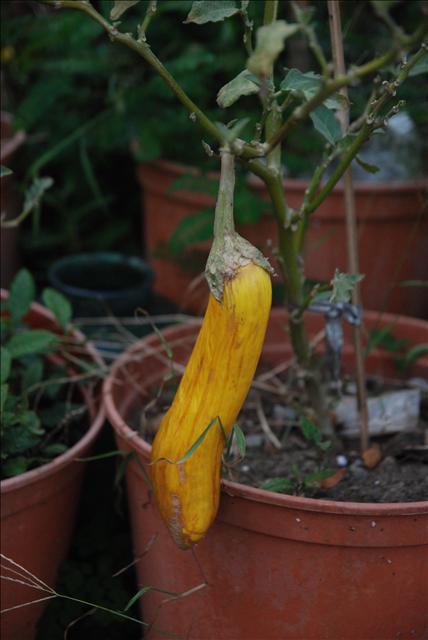明明是發育不良,枯黃的茄子,咪咪卻很驚奇:「居然有黃色的茄子!」我說:「你再晚幾天遇見,就是咖啡色的茄子。」