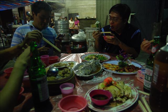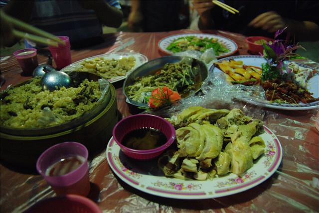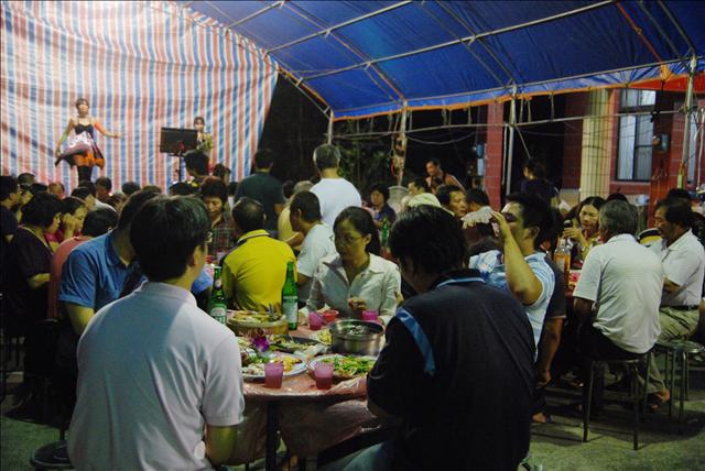 各色菜餚都很有客家風味,油雞、油飯、蹄膀,還有堆得像山高的啤酒、飲料,客人要吃飽,主人才有面子。