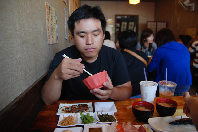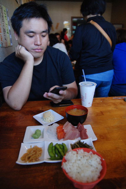 看著生魚片,沒味口的旅行作家小胖。「生魚片定食」是我點的,除了主菜不同,其它簡餐的配菜都相同。